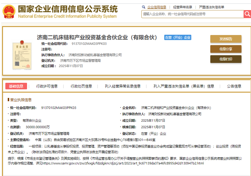 11月7日,济南市“工业强市”战略再结硕果——济南首只聚焦高端数控机床与机器人产业的CVC基金“济南二机床链和产业投资基金合伙企业(有限合伙)”顺利完成注册设立,首期规模3亿元。该基金由济南财金集团与济南二机床集团联合发起,依托“金融资本+产业龙头”双轮驱动模式,将精准投向工业母机产业链上下游优质企业。